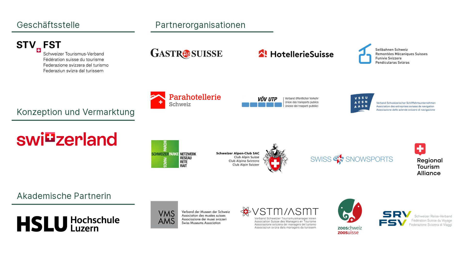 GastroSuisse, HotellerieSuisse, Netzwerk Schweizer Pärke, Parahotellerie Schweiz, RTA, Schweiz Tourismus, Schweizer Alpen-Club SAC, Schweizer Reise-Verband, Schweizer Tourismus-Verband, Seilbahnen Schweiz, Swiss Snowsports, Verband öffentlicher Verkehr, Verband Schweizerischer Schifffahrtsunternehmen, Verband Schweizer Tourismusmanager:innen, zooschweiz